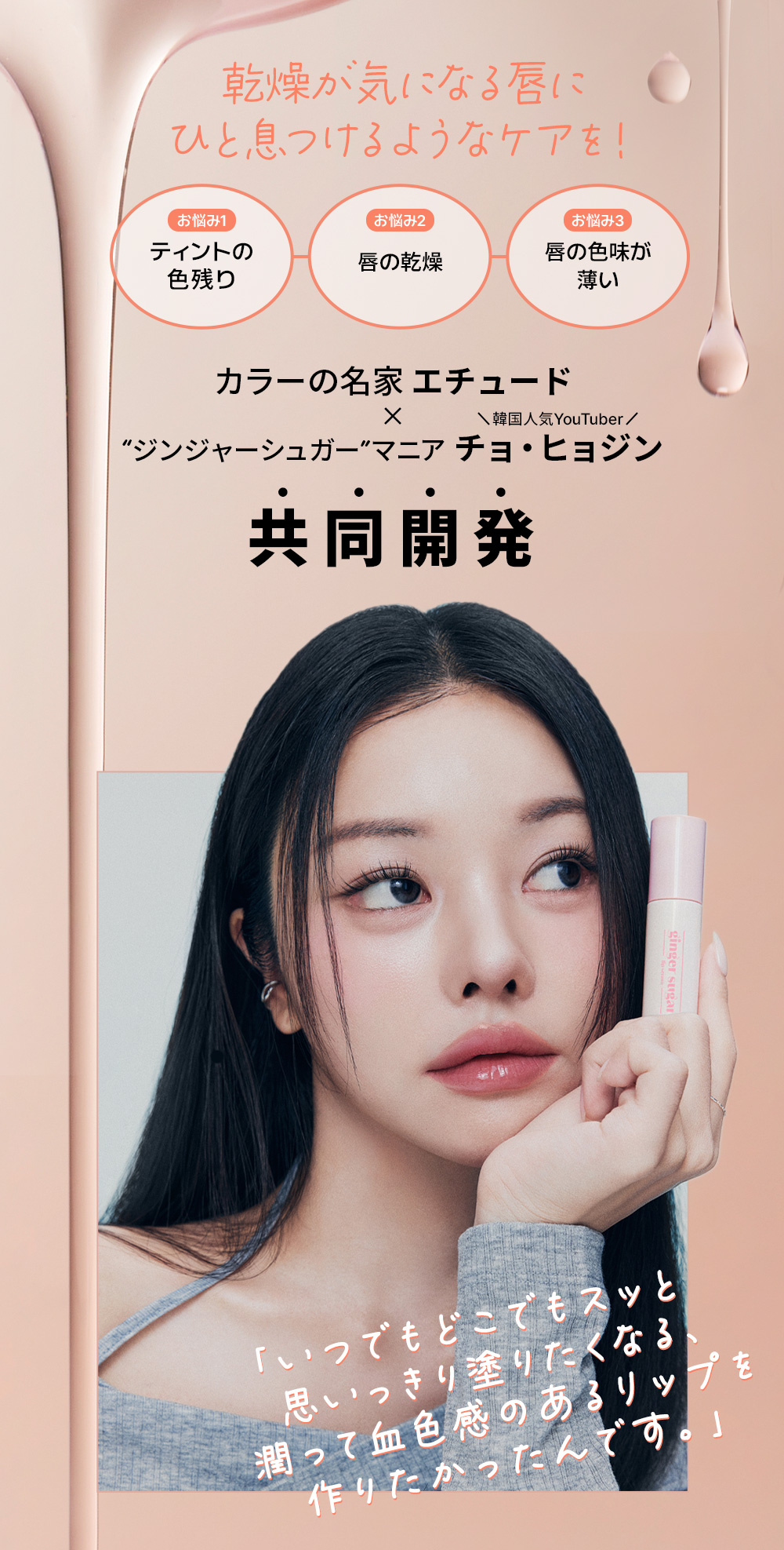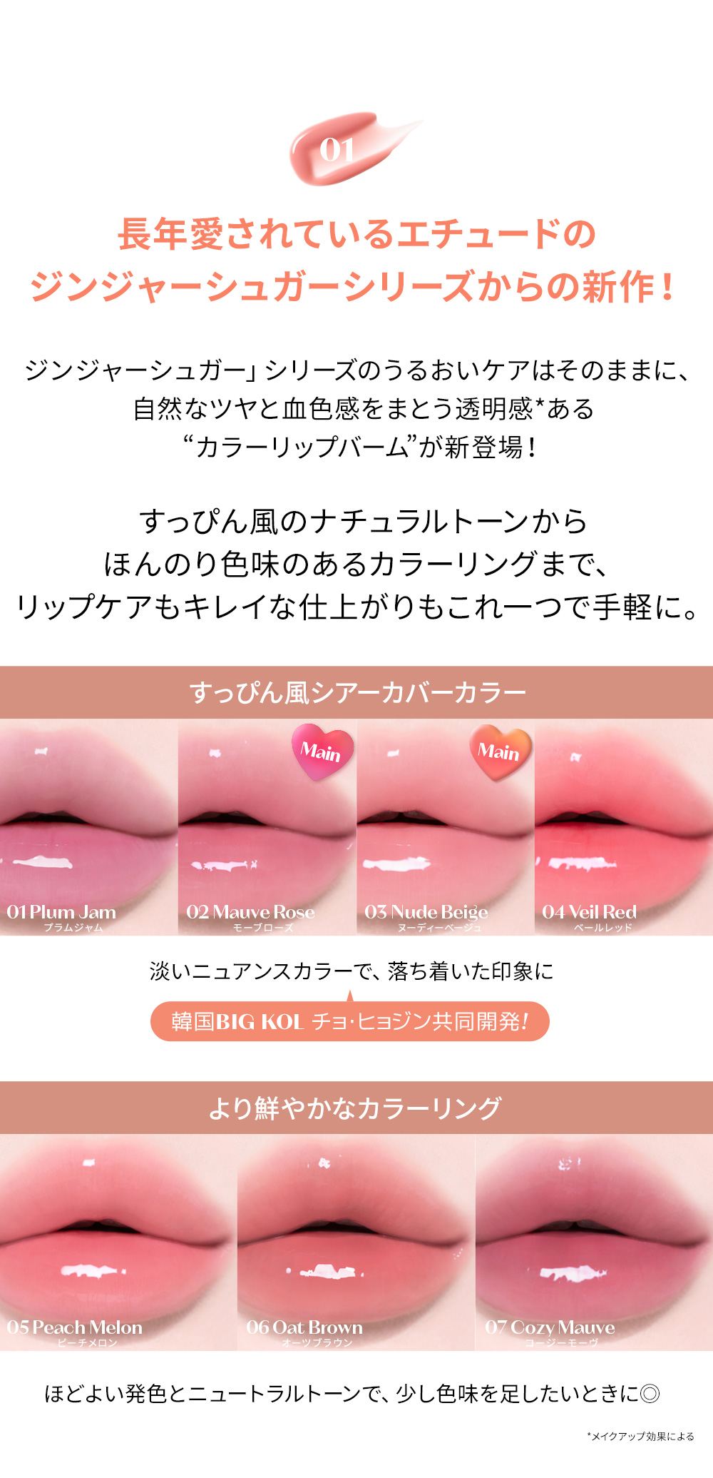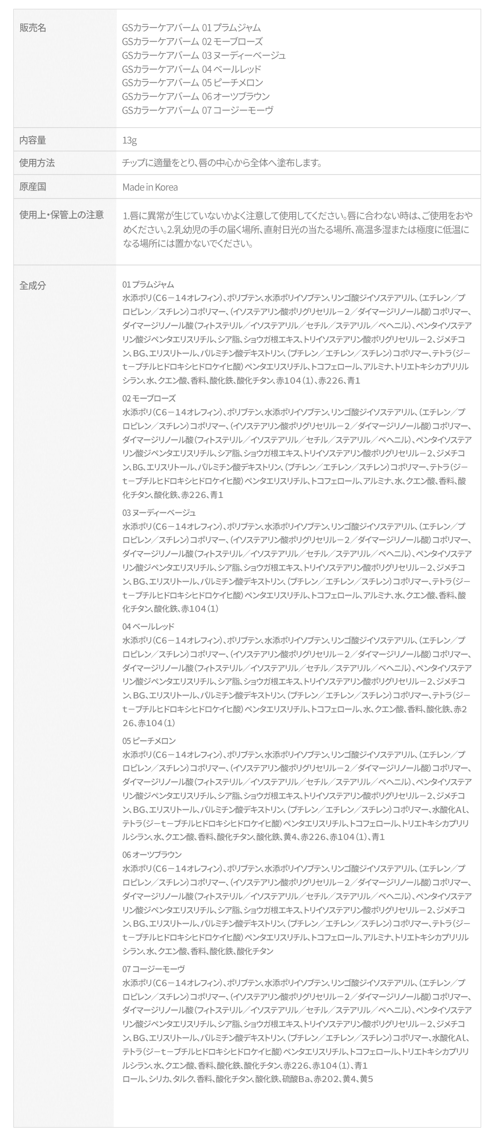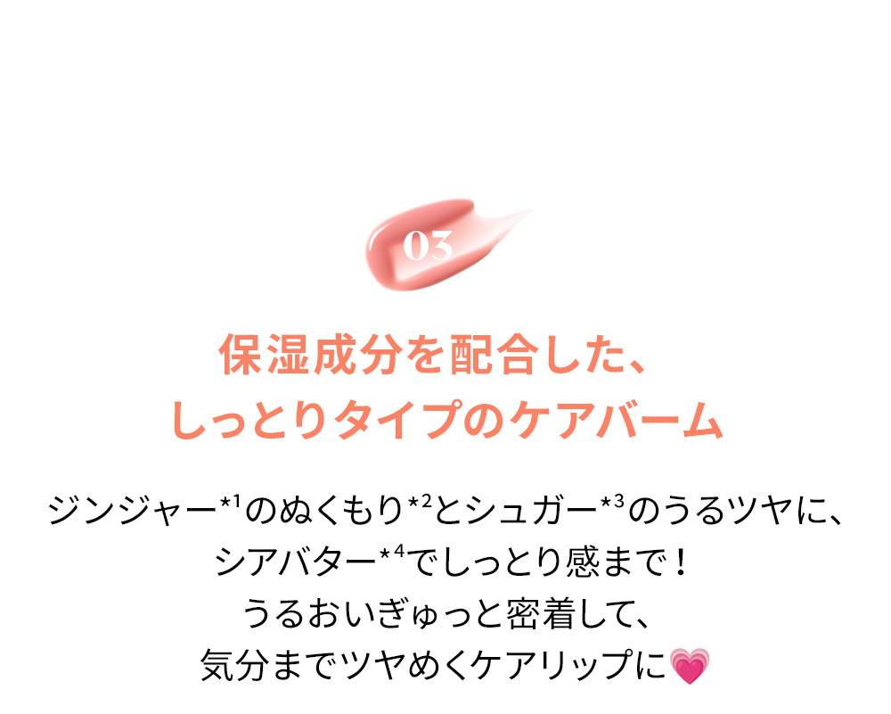 水添ポリ(C6-14オレフィン)、ポリブテン、水添ポリイソブテン、リンゴ酸ジイソステアリル、(エチレン/プロピレン/スチレン)コポリマー、(イソステアリン酸ポリグリセリル-2/ダイマージリノール酸)コポリマー、ダイマージリノール酸(フィトステリル/イソステアリル/セチル/ステアリル/ベヘニル)、ペンタイソステアリン酸ジペンタエリスリチル、シア脂、ショウガ根エキス、トリイソステアリン酸ポリグリセリル-2、ジメチコン、BG、エリスリトール、パルミチン酸デキストリン、(ブチレン/エチレン/スチレン)コポリマー、水酸化Al、テトラ(ジ-t-ブチルヒドロキシヒドロケイヒ酸)ペンタエリスリチル、トコフェロール、トリエトキシカプリリルシラン、水、クエン酸、香料、酸化鉄、酸化チタン、赤226、赤104(1)、青1