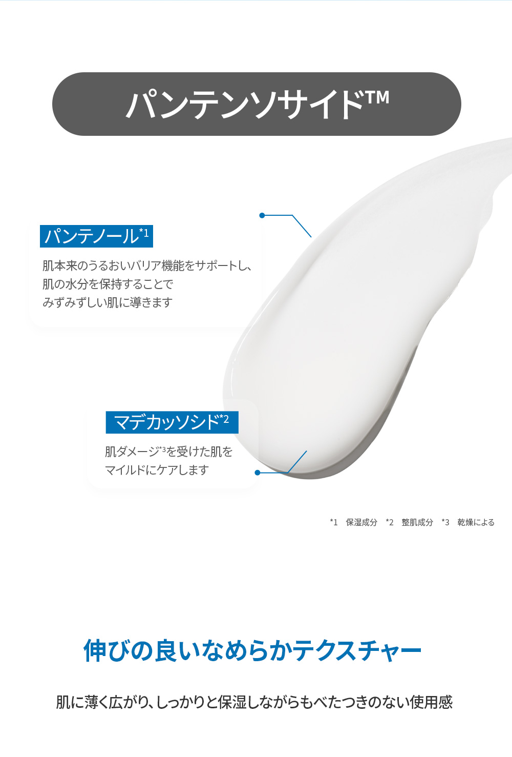 水、グリセリン、プロパンジオール、テトラエチルヘキサン酸ペンタエリスリチル、1,2-ヘキサンジオール、パンテノール、スクワラン、チャ葉エキス、ビスジグリセリルポリアシルアジペート-2、カプリル酸グリセリル、エチルヘキシルグリセリル、マデカッソシド、BG、トコフェロール、セテアリルアルコール、(アクリロイルジメチルタウリンアンモニウム/VP)コポリマー、キサンタンガム、ヒドロキシプロピルデンプンリン酸、(アクリレーツ/アクリル酸アルキル(C10-30))クロスポリマー、ジステアリン酸ポリグリセリル-3メチルグルコース、ステアリン酸グリセリル、水添レシチン、EDTA-2Na、トロメタミン
