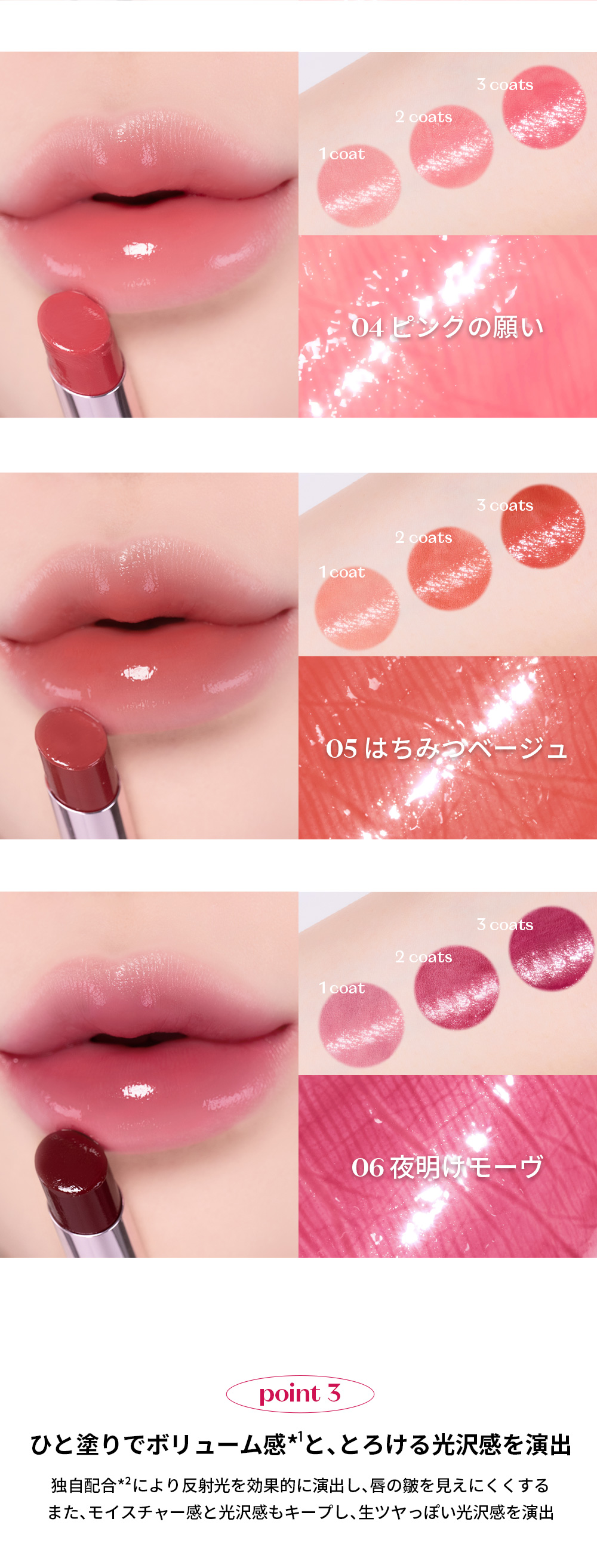 ペンタイソステアリン酸ジペンタエリスリチル、ジフェニルシロキシフェニルトリメチコン、ジフェニルジメチコン、グリセリルウンデシルジメチコン、ラウロイルグルタミン酸ジ(フィトステリル/オクチルドデシル)、合成ワックス、ダイマージリノール酸(フィトステリル/イソステアリル/セチル/ステアリル/ベヘニル)、アルミナ、ラウリルポリグリセリル-3ポリジメチルシロキシエチルジメチコン、トリイソステアリン酸ポリグリセリル-2、ザクロ果実エキス、ザクロ花エキス、レシチン、BG、パルミチン酸エチルヘキシル、ジメチコン、ポリヒドロキシステアリン酸、(エチレン/プロピレン)コポリマー、ポリリシノレイン酸ポリグリセリル-3、イソステアリン酸、トリエトキシカプリリルシラン、グリセリン、水、トコフェロール、水酸化Al、ミリスチン酸イソプロピル、香料、酸化チタン、赤104(1)、赤202、黄5