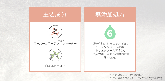 水、ミリスチン酸、グリセリン、PEG-32、水酸化K、ステアリン酸、BG、パルミチン酸、ラウリルヒドロキシスルタイン、ステアリン酸PEG-100、ステアリン酸グリセリル、加水分解シロバナルーピンタンパク、加水分解コラーゲン、エチルヘキシルグリセリン、ジステアリン酸グリコール、ポリクオタニウム-7、1,2-ヘキサンジオール、EDTA-2Na、乳酸、クエン酸、安息香酸Na、香料